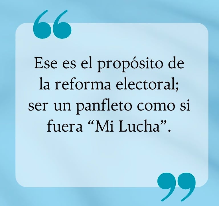 Ese es el propósito de la reforma electoral; ser un panfleto como si fuera “Mi Lucha”. Un Congreso dominado por una sola fuerza, cualquiera que ésta sea, es decir, de derecha, de izquierda, centro, centro izquierda, centro derecha, socialdemócrata, republicana o demócrata, deja de ser un órgano legislativo plural y se convierte en una sola voz.
