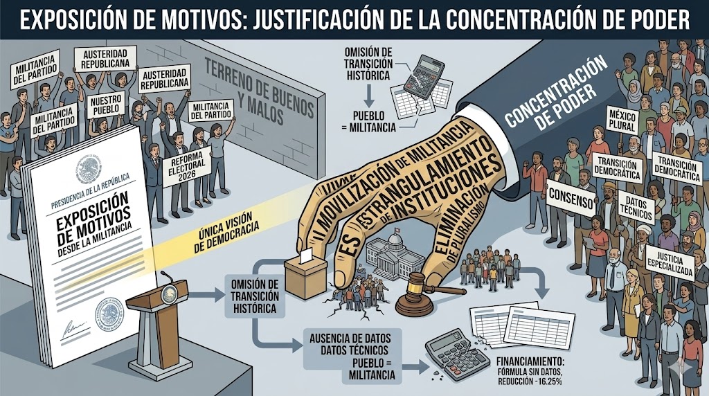 Pretender que la visión presidencial que decidió no dialogar con la pluralidad política cumple con un compromiso adquirido ante el pueblo y que presenta manifestaciones políticas desde una visión de un movimiento político nos coloca en el escenario en donde el poder ejecutivo entiende al pueblo como la militancia de su opción política, estamos frente a una exposición de motivos que busca justificar la concentración de poder.
